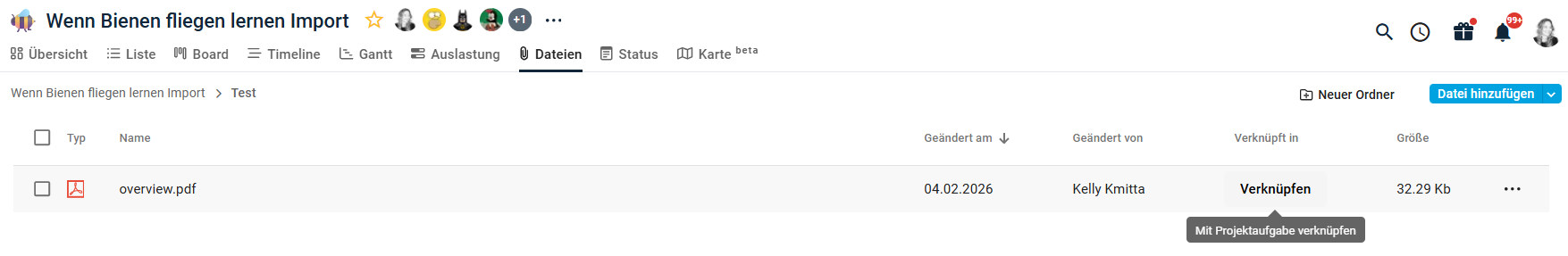 Aufgaben-Anhänge werden im Dateien Tab des Projekts angezeigt.