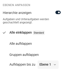 - Aufklapp-Ebene pro Ansicht speichern: Lege fest, welche Hierarchieebene beim Öffnen einer Listenansicht standardmäßig aufgeklappt sein soll - z. B. alle Ebenen aufgeklappt, nur Hauptaufgaben oder auch Unteraufgaben bis zu einer bestimmten Ebene. Die Einstellung wird in der Ansicht gespeichert.