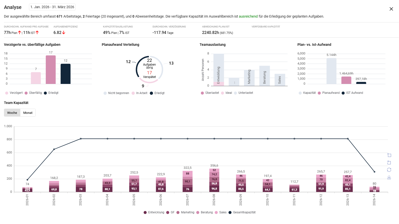 Die Analysefunktion der Auslastungsansicht wurde ausgebaut: Das Analyse-Panel erhält einen eigenen, prominenteren Button, wird jetzt ganzseitig dargestellt und bietet eine neue, skalierbare Zeitachse (in einer Wochen- oder Monatsansicht) zur Darstellung der Teamkapazität. Die Teamkapazität und geplante Stunden werden als Linien- und Balkendiagramm visualisiert - gestapelt nach Teams.