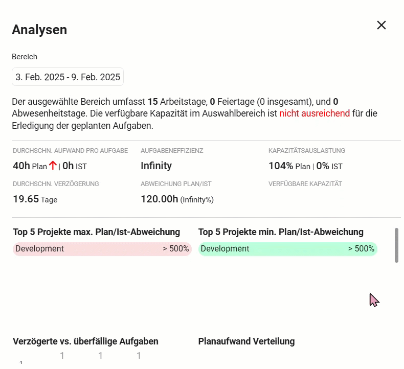 Das Analysepanel kann je nach Konfiguration verschiedene Kennzahlen darstellen, wie z. B. die Summe der geplanten Stunden, Durchschnittswerte oder prozentuale Auslastungen im betrachteten Zeitraum. Dadurch erhältst du eine noch genauere Übersicht über mögliche Engpässe oder Überlastungen.