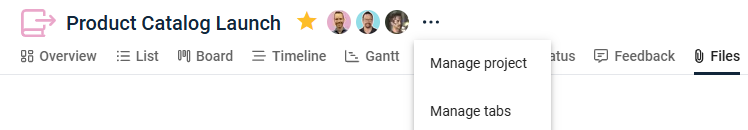 You can upload files directly in the project or add them in the Files tab of a project. All files created in the project context (including from tasks and status reports) are available in one place in the Files tab.