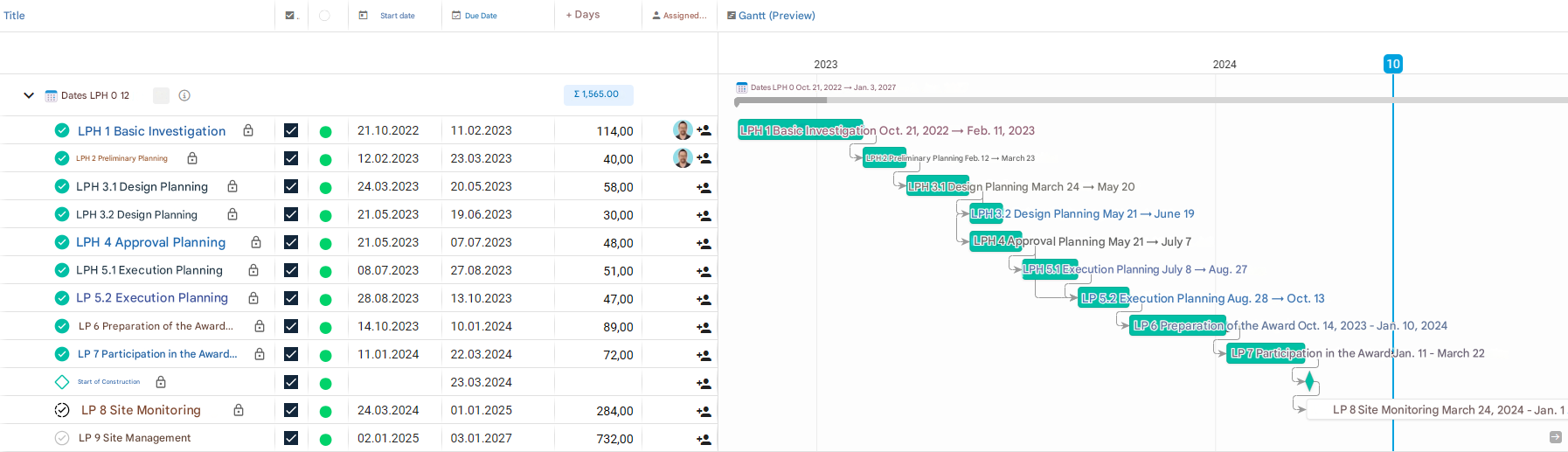 - Start and due dates of the service phases are listed in detail.