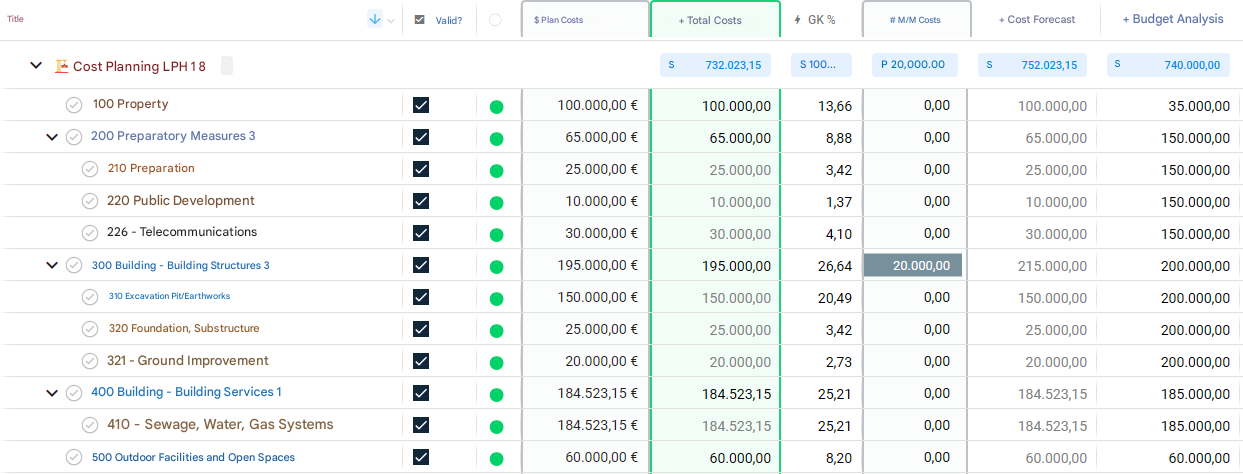 The software provides structured management of construction costs according to the cost groups of DIN 276: