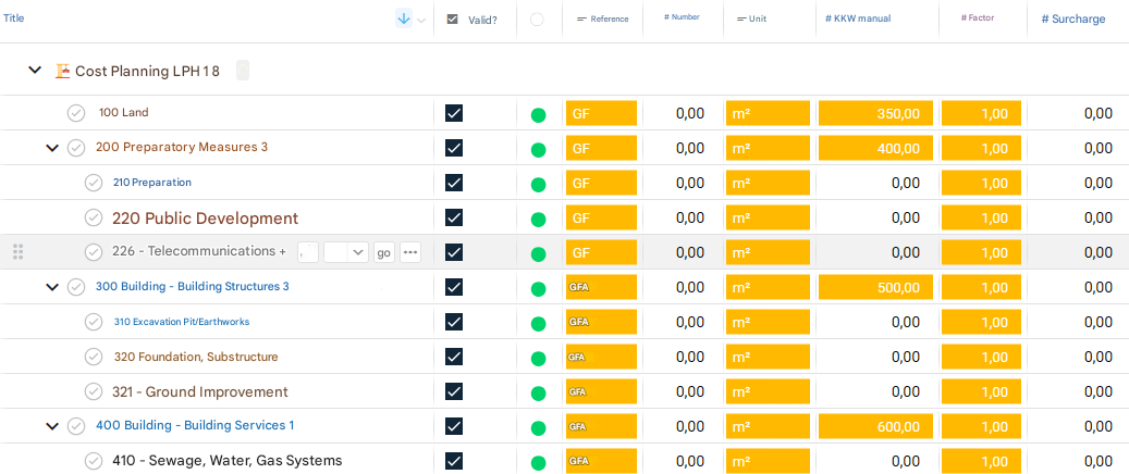 - Definition and assignment: Users can define planned costs in detail and assign them to the corresponding cost groups and service phases.