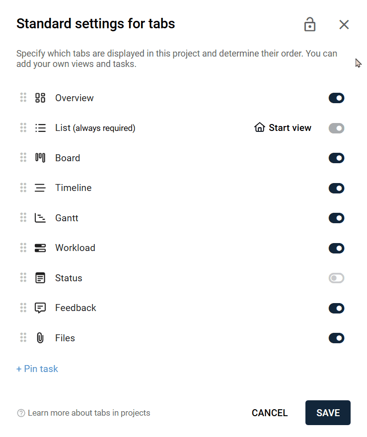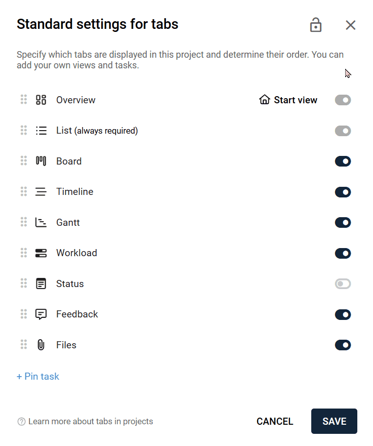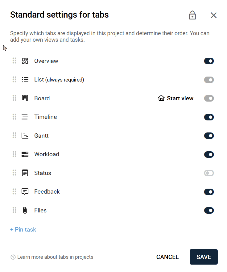 - Pin tasks as tabs: Save important tasks directly as their own tab in the project so they are faster to access.