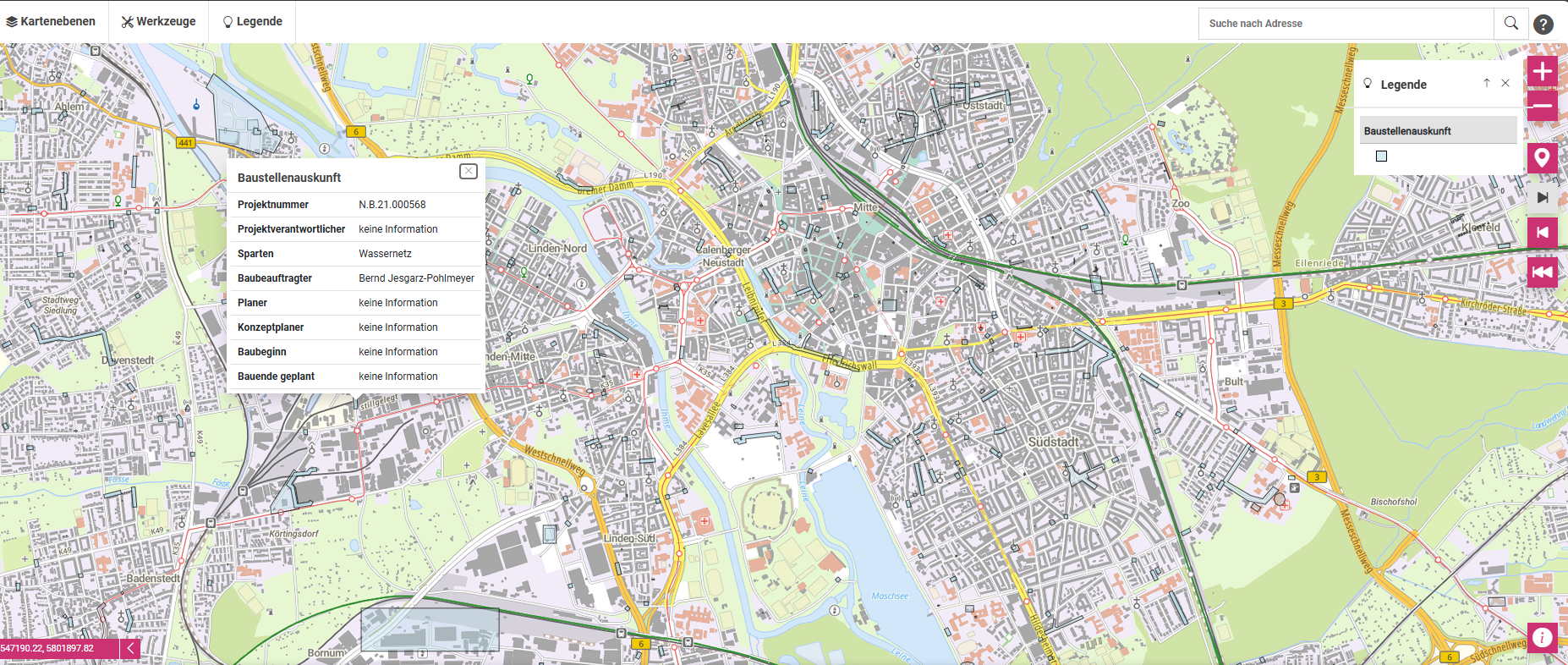 Flavors of type Location or Area store geodata (e.g. addresses or coordinates) directly on tasks or projects. The map tab displays all entries with geodata on an interactive map. Hovering or clicking reveals additional information from the task/project.