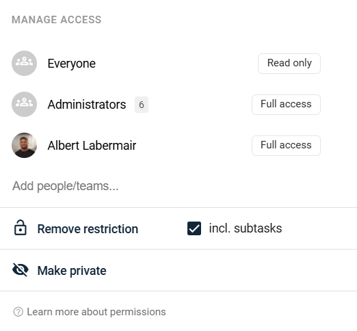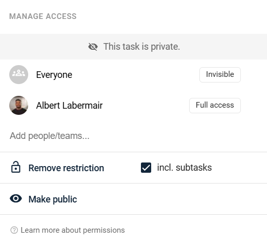 - Extended permission system: Private tasks are only visible to people who explicitly have permission. For authorized people you can also differentiate whether they have read-only rights or full access.
