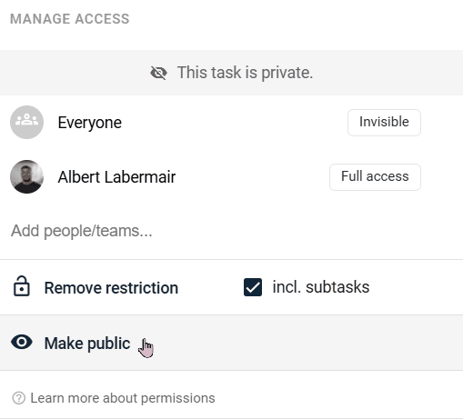 - Remove restriction: The task becomes visible to everyone again and all restrictions are lifted.