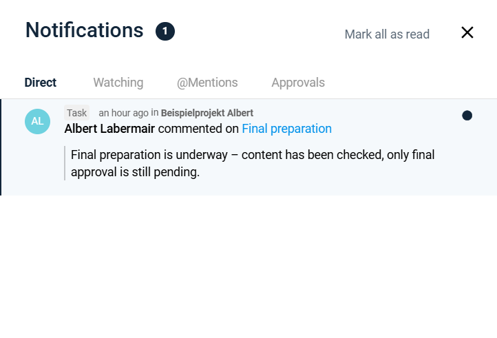 You will receive a notification when someone comments on a task that is directly assigned to you. You will also receive a notification if someone mentions you via @Name – even without an assignment.