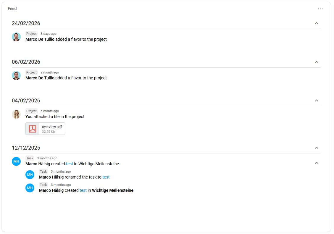 The feed is especially useful after a longer absence – you can see at a glance what happened in the project while you were away.