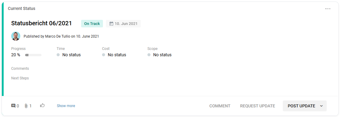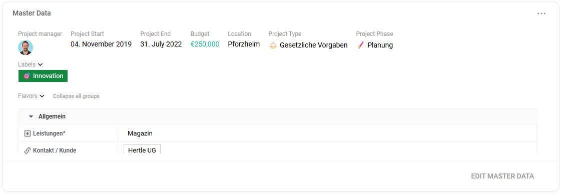 - Shows: Key project information at a glance – e.g. project name, responsible persons, timeframe, and other master data.