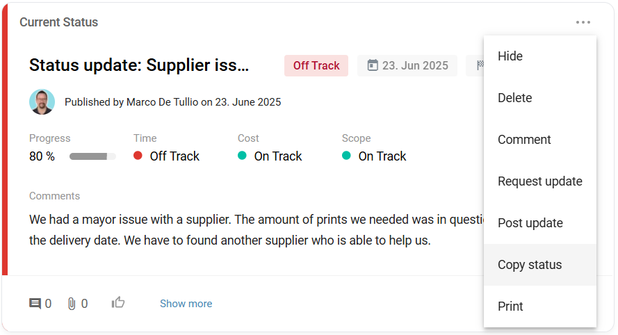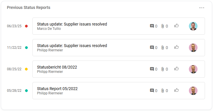 The Status area brings together everything related to the current status and status history of a project. Here you can see the status at a glance, track developments, and open older status reports if needed.