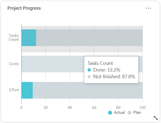 - Shows: Progress/development of tasks, costs, and effort.