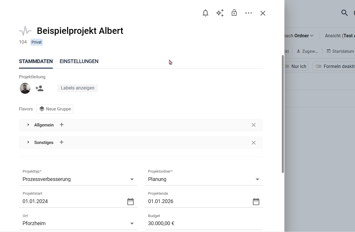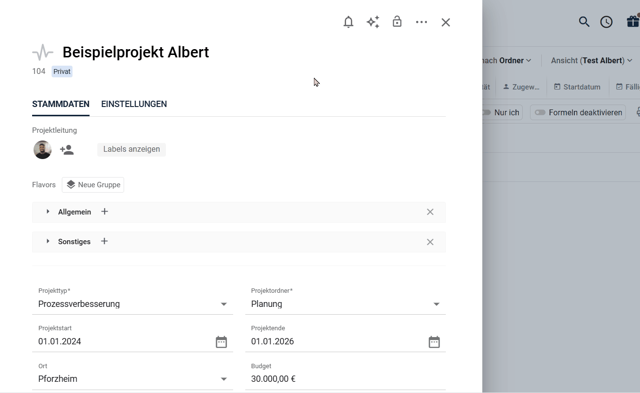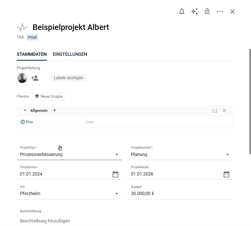 In the Master data area, you can maintain the most important project data. By default, the following fields are available, among others:
